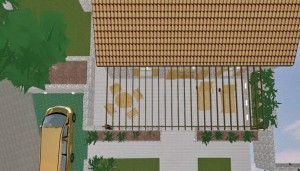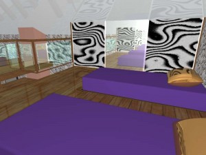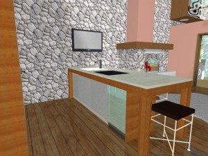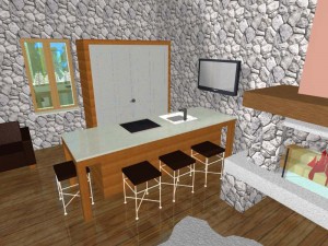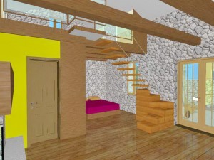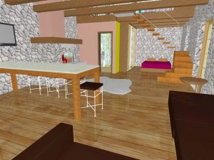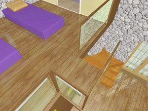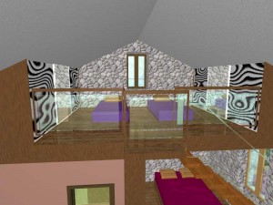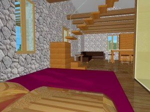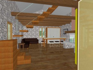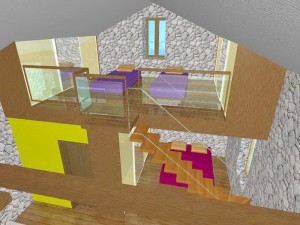 Nad dijelom boravka je otvorena drvena galerija sa prostorom za spavanje i ormarima u kosinama krova. Kupaonica ima veliki zidani tuš sa kamenom stijenom zaštićenom staklom. Spavaća soba je poluzaklonjena stepenicama. Sav namještaj u kući je pažljivo dizajniran kako bi se mali prostor u potpunosti iskoristio. Velika terasa zaštićena je pergolom s penjačicama i zidanim žardinjerama sa mediteranskim trajnicama.