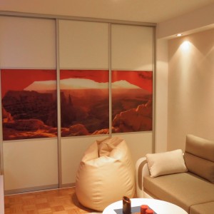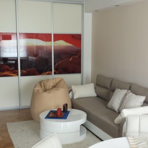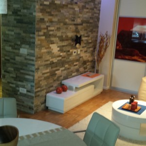 U elegantnom i modernom dnevnom prostoru svijetlih pastelnih boja ističe se zid obučen u kamen.U niši je veliki ugrađeni ormar s kliznim vratima ukrašenim predivnom slikom krajolika.