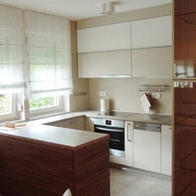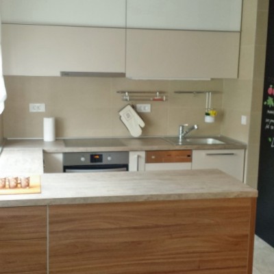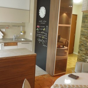 Komforna kuhinja U-oblika sa zanimljivim šankom ukrašena je pločom za zapisivanje recepata. Višenamjenski element između predsoblja i kuhinje ima u sebi ormar za cipele,staklenu vitrinu sa strane boravka i ploču u kuhinji.