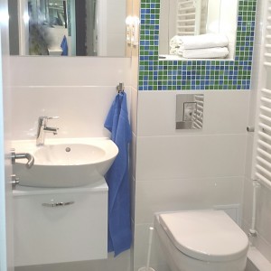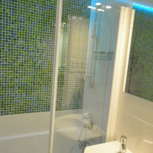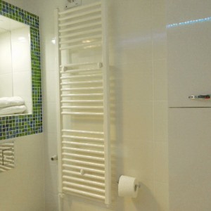 U drugom ormaru u predsoblju, iza staklene stijene sa slikom bambusa je perilica ,kao i prostor za vješanje jakni. Time je rasterećena mala kupaonica koja je dobila veliku kadu sa spa ugođajem i mozaicima osvjetljenim LED rasvjetom u bojama.