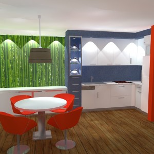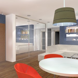 Dnevni dio je moderan i otvoren- sa puno skladišnog prostora u ugrađenim ormarima sa kliznim vratima u ogledalima. Veliki L višesjed je ispred niša izvedenih u knaufu. Moderna kuhinja je uklopljena u boravak, pažljivo je dizajnirana i potpuno zadovoljava potrebe vlasnika. Visoki element između kuhinje i blagovanja je u istom denim uzorku kao i zid s nišama u boravku.