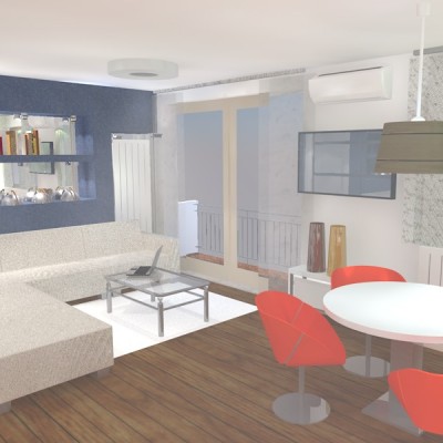 3D dizajn interijera sa namještajem i rasvjetom za moderan mali stan.