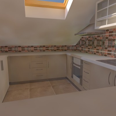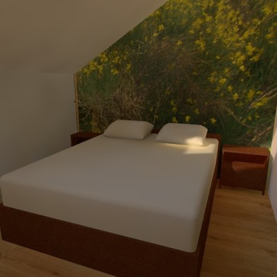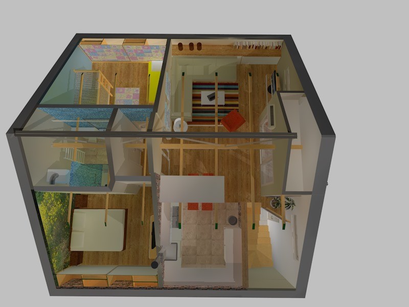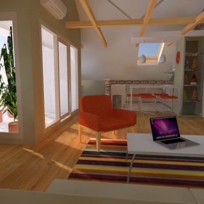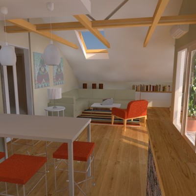 Na suprotnom kraju boravka organizirana je zona za sjedenje sa velikom kutnom garniturom iza koje je u kosini krova polica za ukrase. Spavaći dio i kupaonica su izdvojeni u dno stana. 2 spavaće sobe imaju ugrađene ormare s kliznim vratima u kosinama krova.