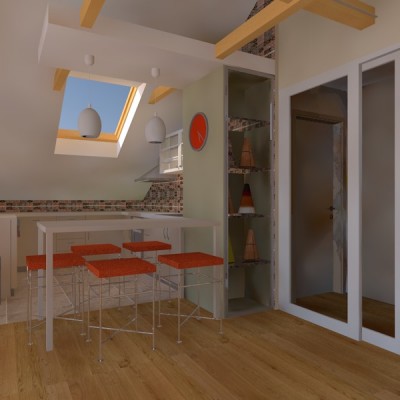 Potkrovlje od 120 m2 pretvoreno je u zanimljiv i elegantan stan sa 2 spavaće sobe. Dnevni prostor i kuhinja imaju atraktivan strop vis. 4 m, sa postojećim gredama obučenim u drvo.Funkcionalna kuhinja je U -oblika. odijeljena je elementom ormar/šank/stol za objedovanje.